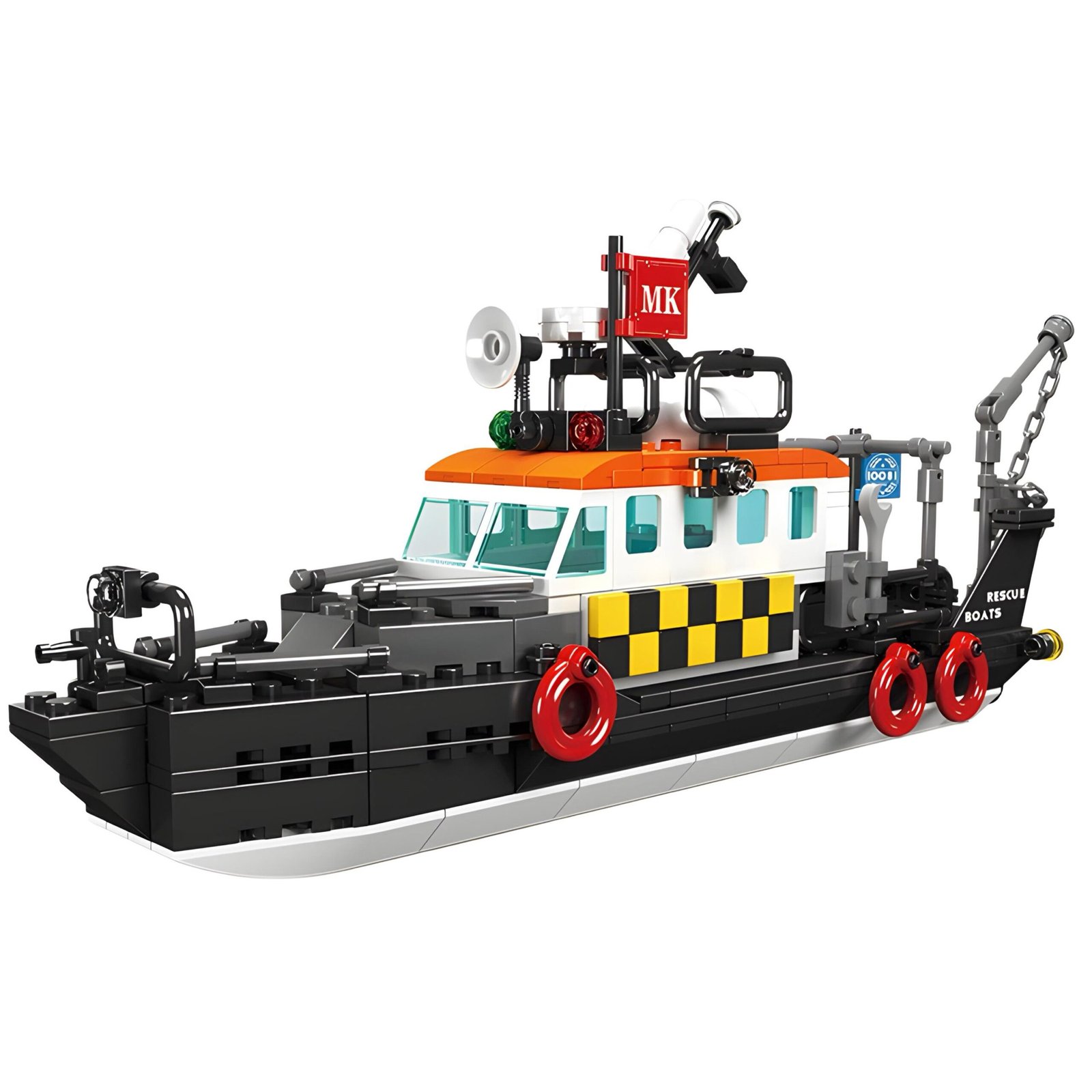 Measuring 26 cm in length, the Rescue Boat by OrboX® features a striking combination of black, white, and orange, accented with vivid red details. This model is equipped with a variety of functional elements designed to simulate real-life rescue operations. Key highlights include a simulated crane for hoisting supplies, a well-equipped command bridge, and detailed rescue tools.